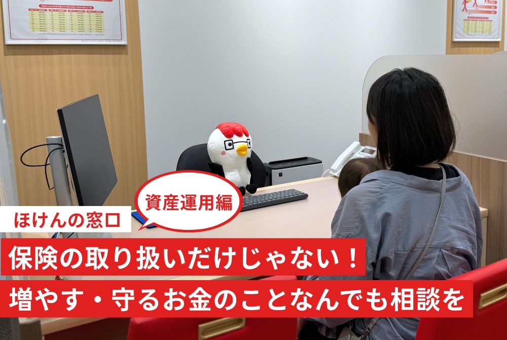 「ほけんの窓口」さんは、全国に約680店舗を持つ保険の代理店です。お金のことをなんでも話せる「しゃべり場」のような存在で、保険やお金についての疑問や不安をじっくり聞いてくれます。保険の取り扱いだけではなく、将来に備えた各家庭の人生設計を総合的にみてくれます。「保険、住宅ローン、貯蓄や投資などお金に関することならなんでも相談して!」と担当のファイナンシャルプランナーさんがさわやかに話してくれました。ということで、保険の見直しと一緒に、資産運用についても相談!
