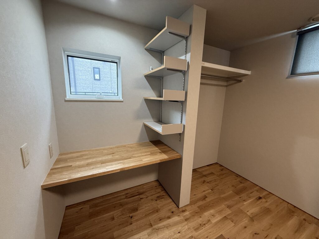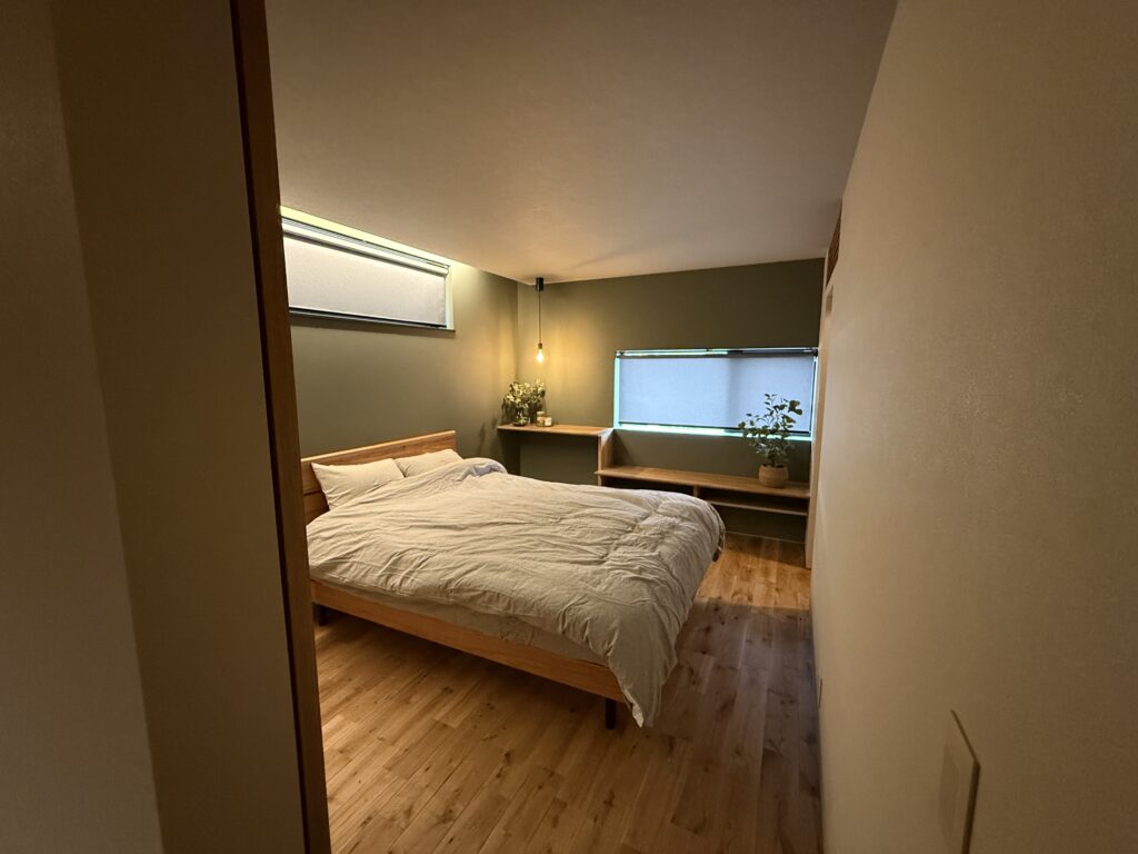 天井や床には温かみのある木が使われており、あえて低めにした天井や部屋をスッキリと見せられる間接照明がさらに居心地の良さをアップしてくれます。寝室には、デスクにもベンチにもなる造り付けの家具を設置。木にこだわる工務店ならではの雰囲気です。