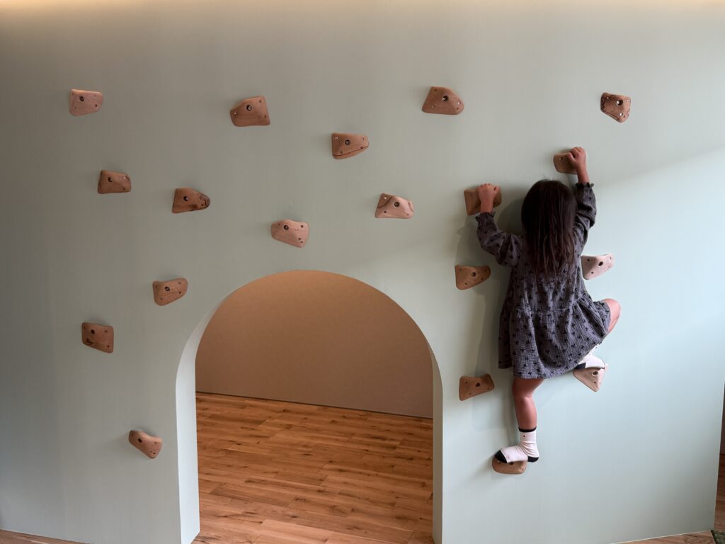 1階の窓際は吹き抜けになっていて2階が見えることに気付いた娘は「早く上がろうよ」と興味津々。この吹き抜けは太陽の光を階下に届けるための工夫です。2階はなんとも素敵な空間でした!階段を上がってすぐにミントグリーンの壁とトンネル。トンネルをくぐるとボルタリングの壁や絵本を楽しめる読書スペースが広がります。子ども部屋に設計された部屋は、可動式の棚が付けられていました。