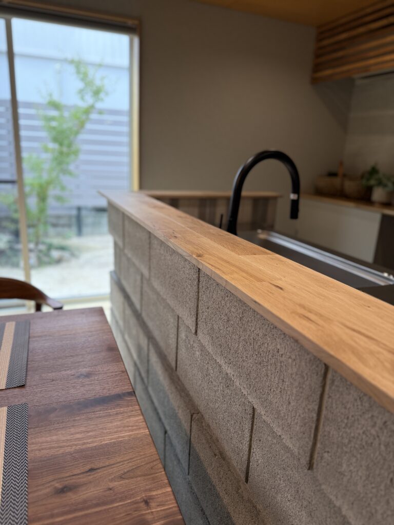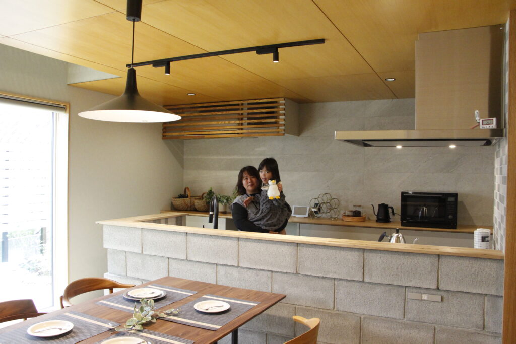 中に入り最初に目についたのが、コンクリートブロックの対面キッチン。今までに見たことのないデザインでとても斬新でした。コンクリートブロックにはコンセントが付けられており、ダイニングでホットプレートが使いやすいなど、暮らしやすさにこだわった設計も素敵だと思いました。